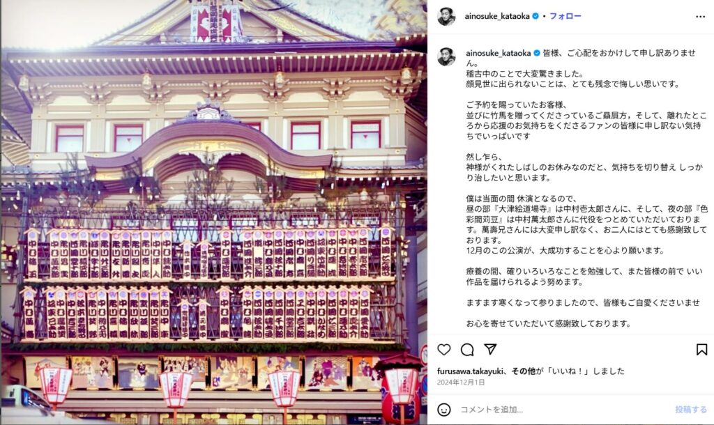 「當る巳歳 吉例顔見世興行」の稽古中、7メートルの高さから降りてきた木製パネル(幅約2メートル、縦約1メートル)に顔面を強打する事故が発生したのです。