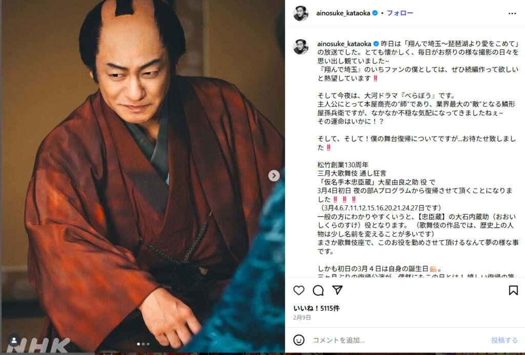 復帰公演では、歌舞伎座の「通し狂言 『仮名手本忠臣蔵』」で大星由良之助役を演じることが決まっており、愛之助さんにとって意義深い役どころとなりそうです。
