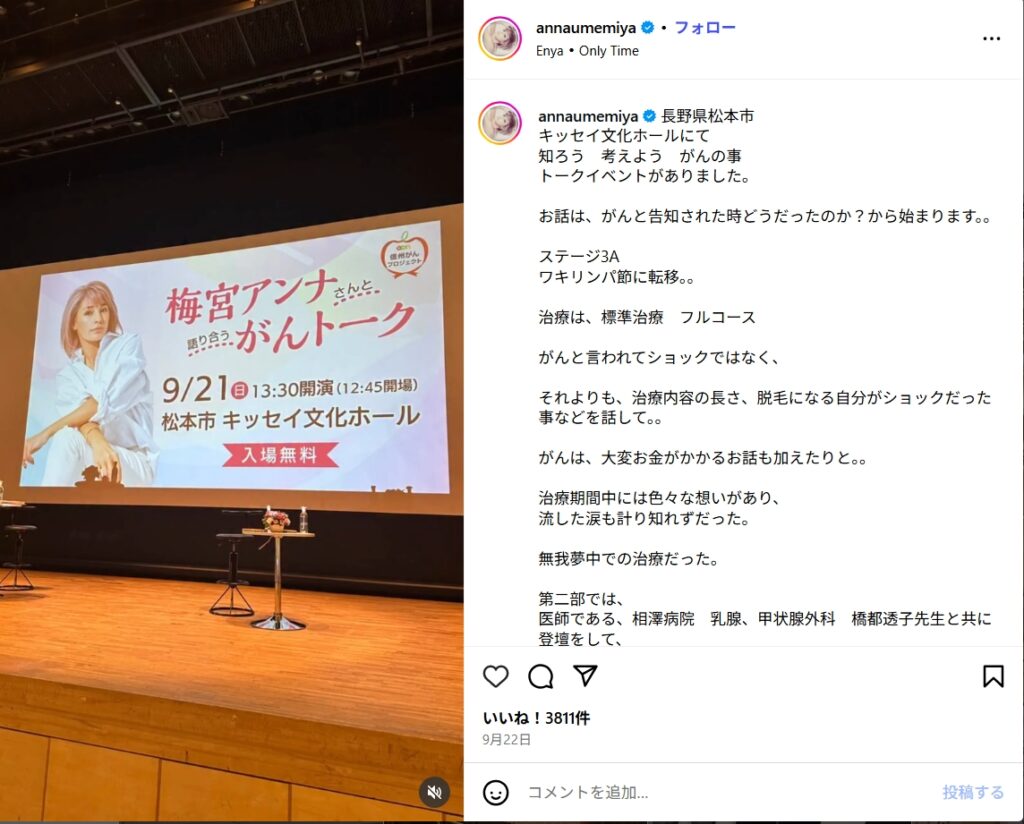 梅宮アンナさんは浸潤性小葉がんステージ3Aと闘っています。