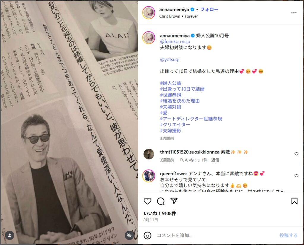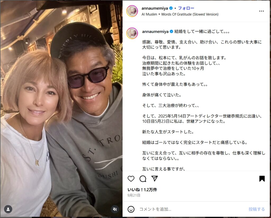 結婚から約4ヶ月が経った現在、梅宮アンナさんと世継さんはとてもラブラブな様子です。