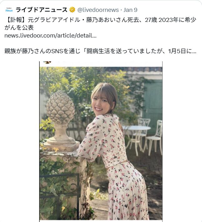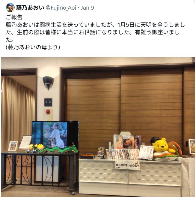 そんな藤乃あおいさんですが、1月5日に逝去したことが伝えられました。