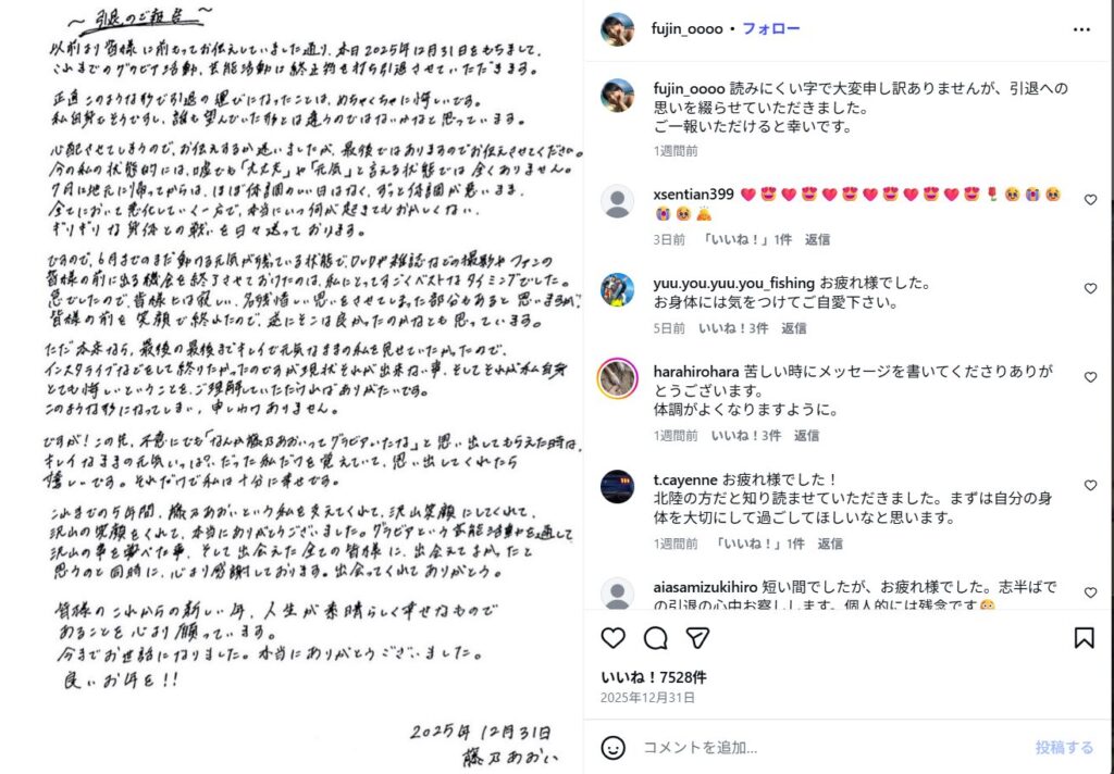 2025年末に芸能活動引退を自ら発表し、自分の言葉で区切りをつけています。