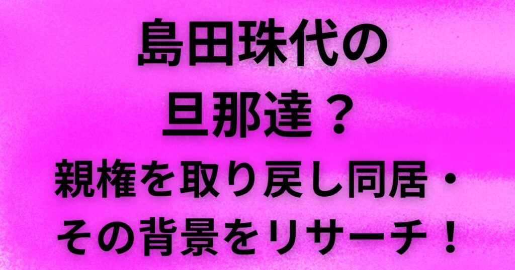 笑いと涙の人生を歩んできた島田珠代さん。 そんな島田珠代さんですが、2度の結婚と離婚を経験し、娘との別居を乗り越えてきたのでしょうか? 島田珠代さんの旦那達との関係や、親権を取り戻すまでの道のりが気になりますね。 今回は、島田珠代さんの波乱... -
