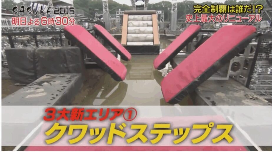 SASUKEでおなじみのコースで、ジャンプ力とバランス感覚が求められる難易度の高い障害物です。