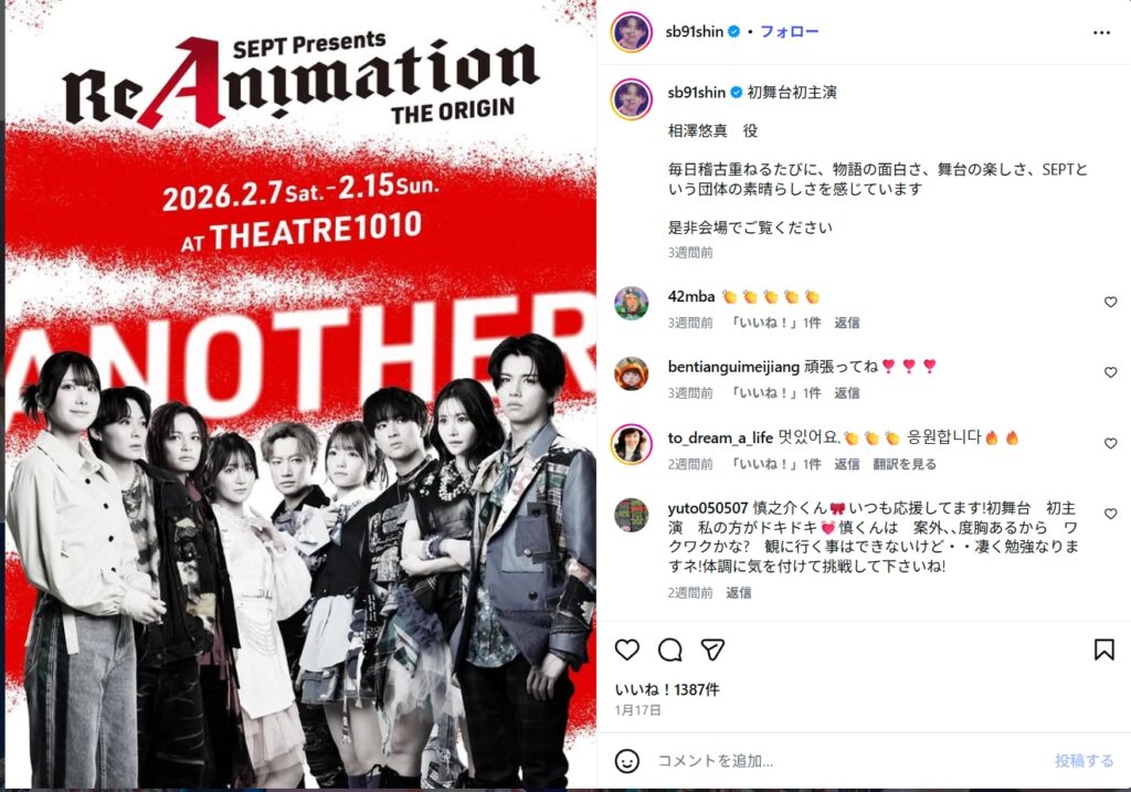 2026年2月7日、木本慎之介さんは東京・北千住のシアター1010で舞台「ReAnimation~THE ORIGIN」で初舞台デビューしました。