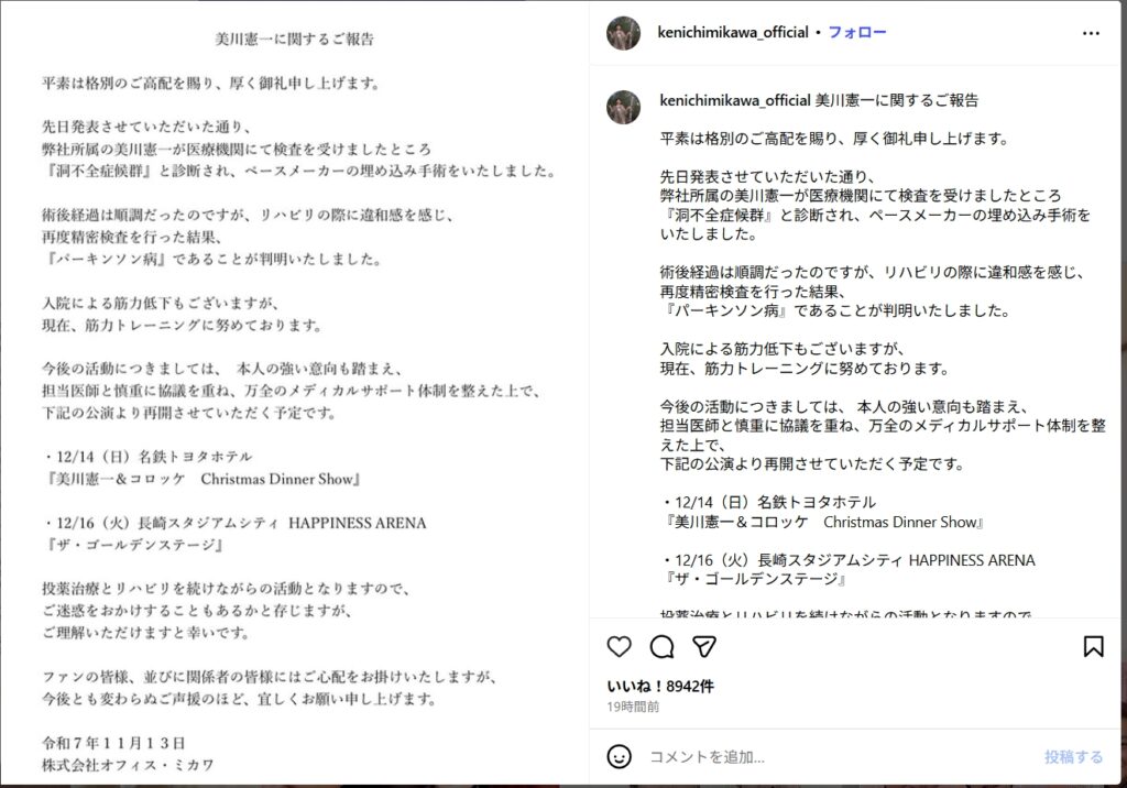 美川憲一さんのパーキンソン病および洞不全症候群の公表は、2025年11月13日に行われ、9月の洞不全症候群の手術後のリハビリ中に違和感を感じて精密検査を受けた結果、パーキンソン病と診断されたという経緯でした。