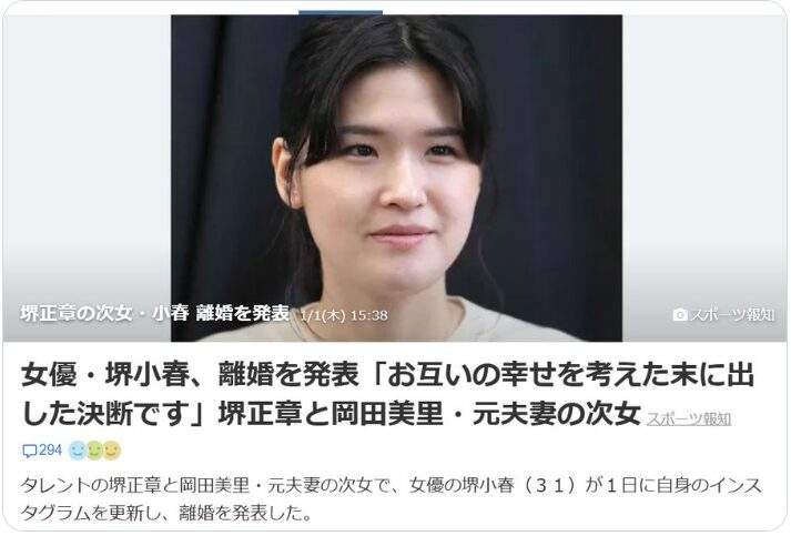 堺小春さんは二〇二六年一月一日に自身のインスタグラムで離婚したことを公表しました。