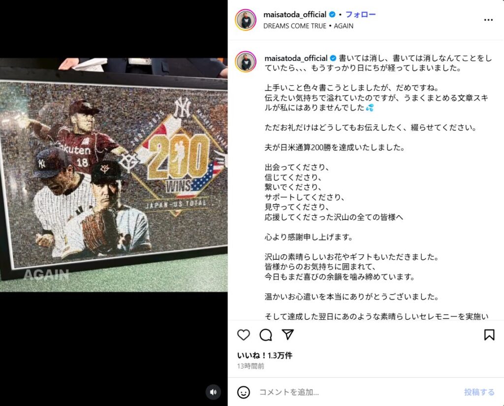 200勝を迎えた日、里田まいさんはインスタグラムで長文のメッセージを投稿しました。
