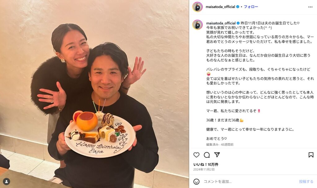 「この数字に至るまで長く苦しんだ時期も少なくなかったように思いますが もがき苦しみながらも立ち向かうことを決して諦めず 何度でも這い上がろうとする生き様は最高にかっこよく、私たちの誇りであり、子どもたちの父として最高の育児の姿でもありました」