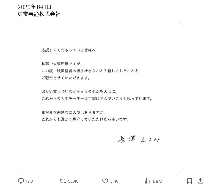 長澤まさみさんは2026年1月1日、所属事務所である東宝芸能の公式サイトを通じて結婚を発表されました。