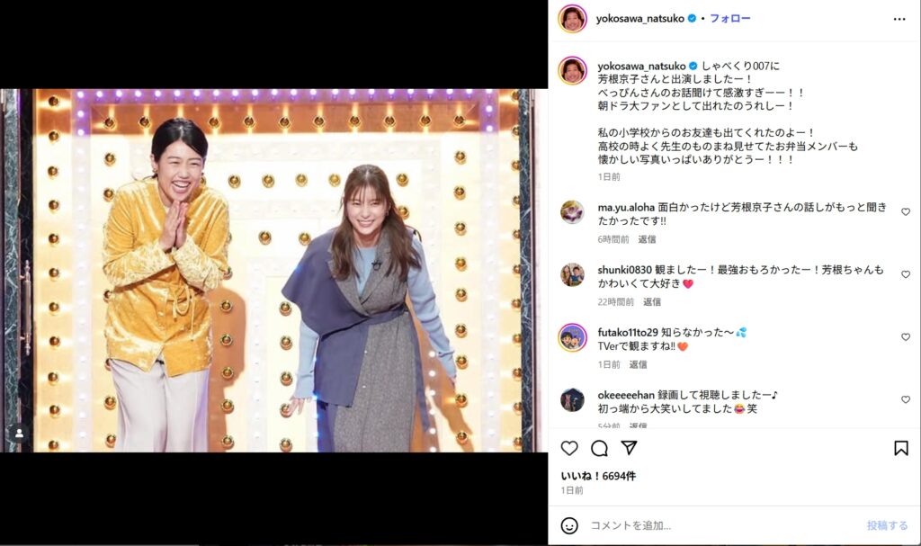 この『しゃべくり007』回は、ゲスト女優・芳根京子さんのドラマ宣伝よりも、横澤夏子さんのリアルすぎる婚活体験が話題を独占したのでしょうか?。