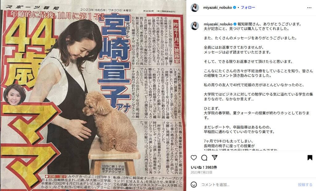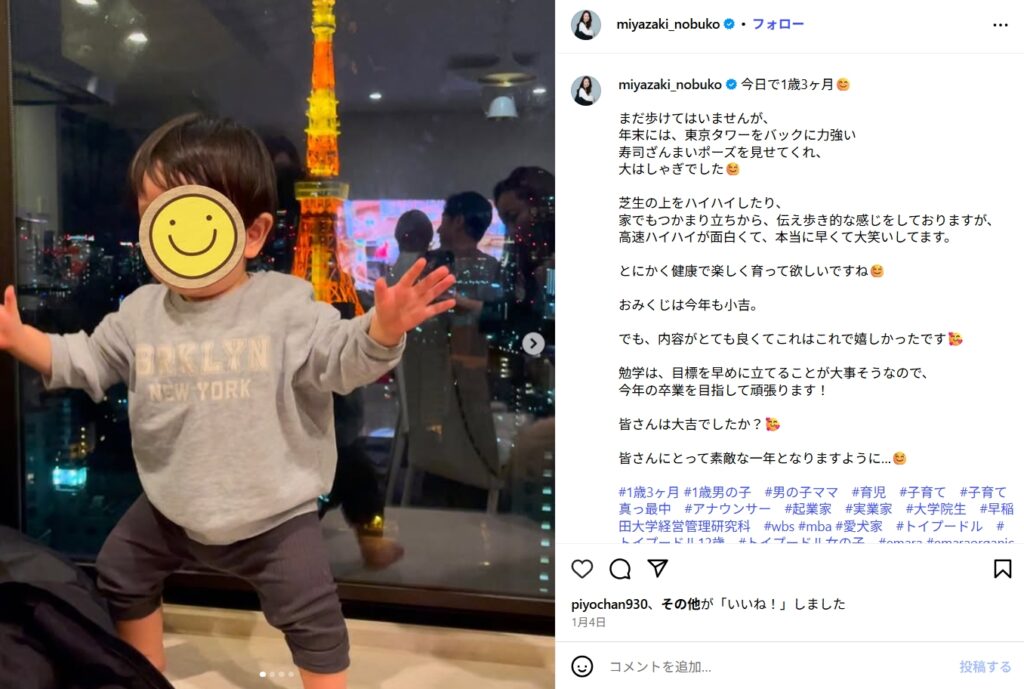宮崎宣子さんの子ども(第一子・長男)は、2023年10月4日に生まれたと報じられています。