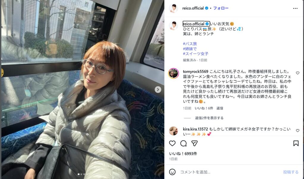 高島礼子さんは自身のインスタグラムで姉とランチに出かけたことを明かしました。