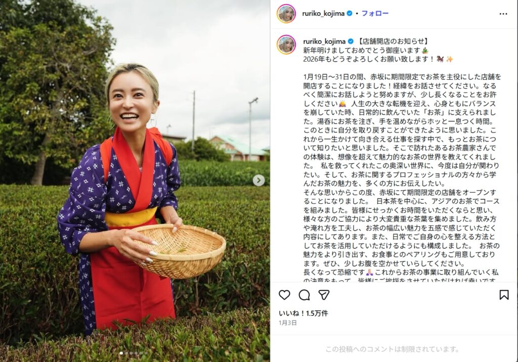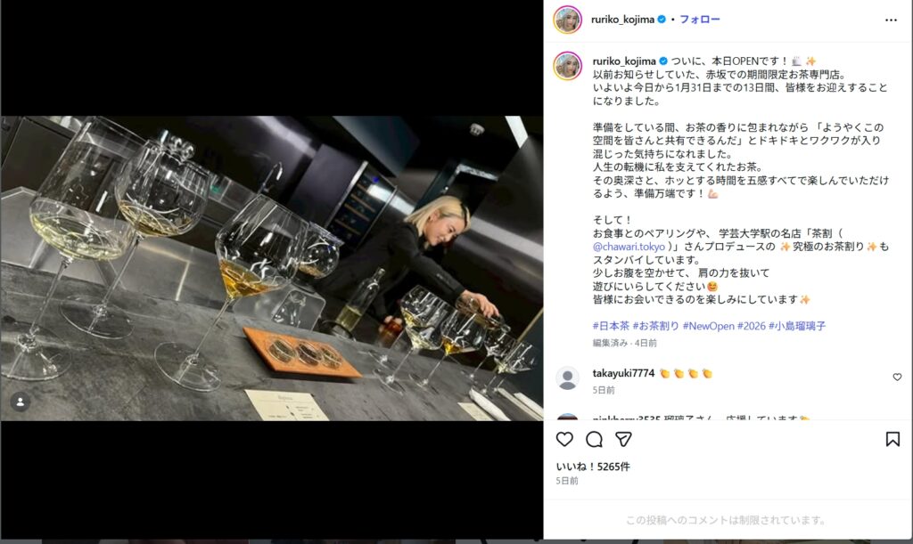 2026年1月、小島瑠璃子さんは東京・赤坂で期間限定のお茶専門店を開き、自ら厨房に立つなど積極的に関わっています。