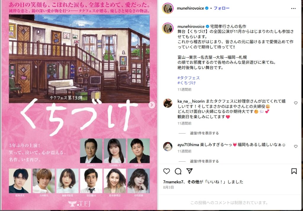 また、舞台にも出演しており、2025年3月には、東京・新宿の劇場で上演された舞台「愛と勇気の物語」に出演し、好評を博しました。