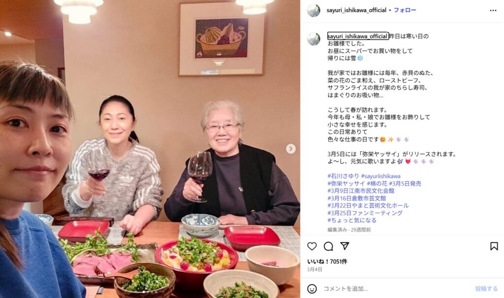 石川さゆりさんは「母と私と娘、女三世代で同居中」と語り、「平凡な日常というのは、ある時ふと、幸せを感じる」と家族との時間を大切にしている様子をうかがわせています。