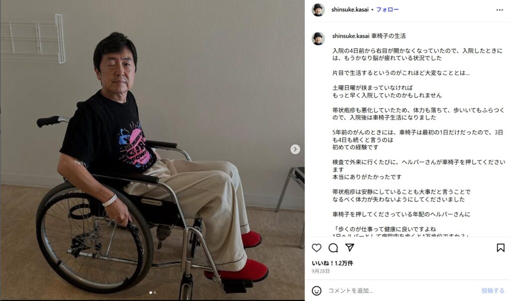 笠井さんは2025年9月25日に緊急入院し、右目の視力が0.2まで低下しています。