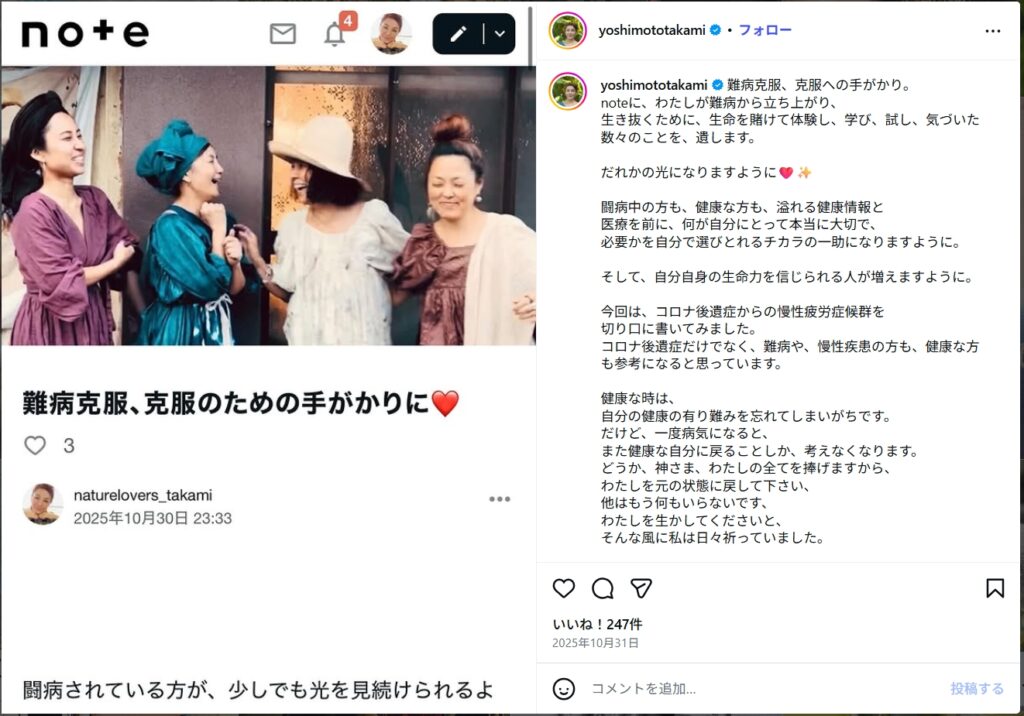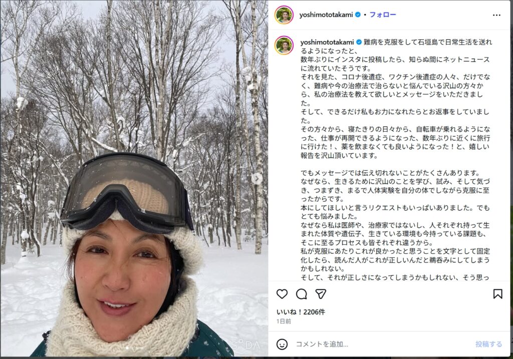 その後、後遺症に苦しむようになり、SNSで「難病になりました」と公表されています。