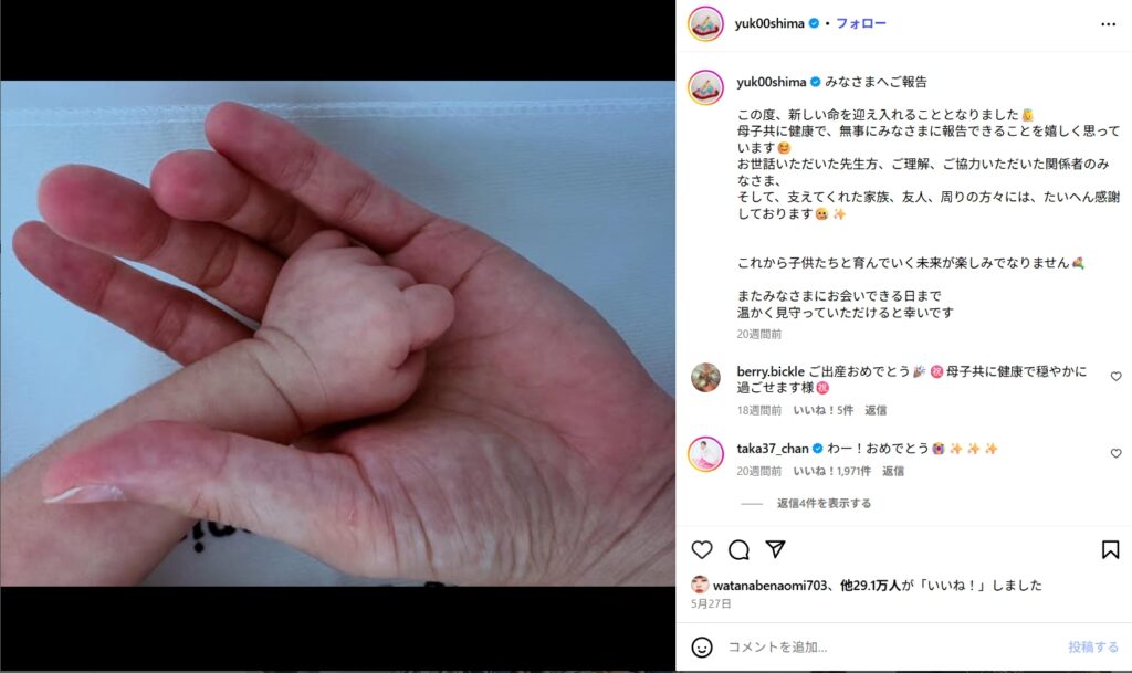 • 出産報告のメッセージでは「母子ともに健康です」「家族そろって新年を迎えることができました」などの記載があります。出典:オリコン